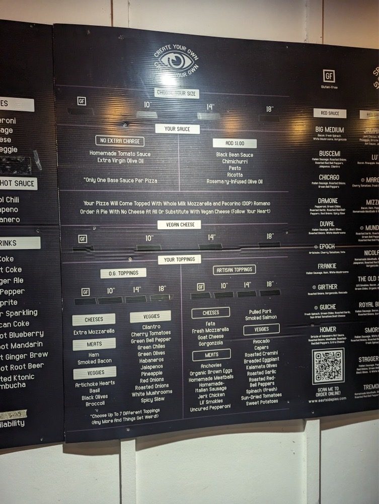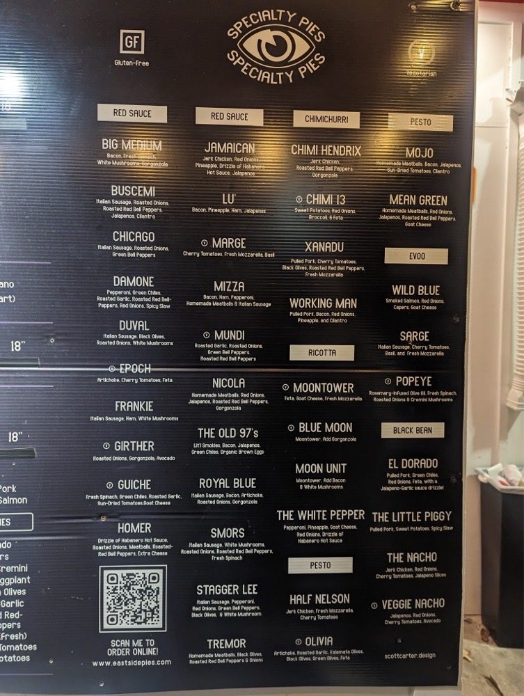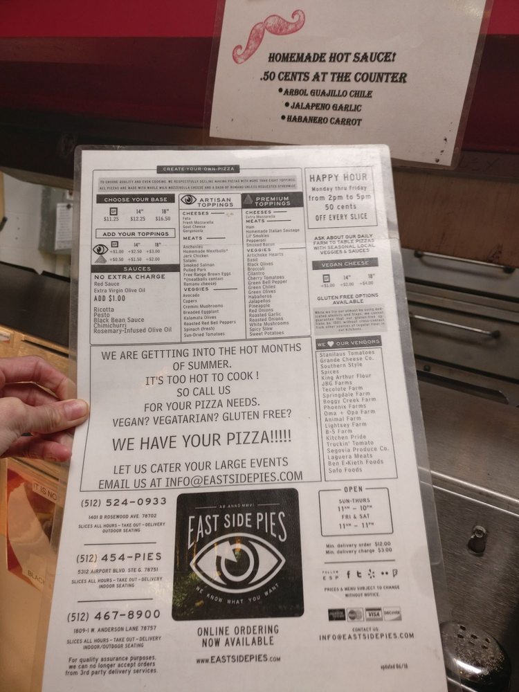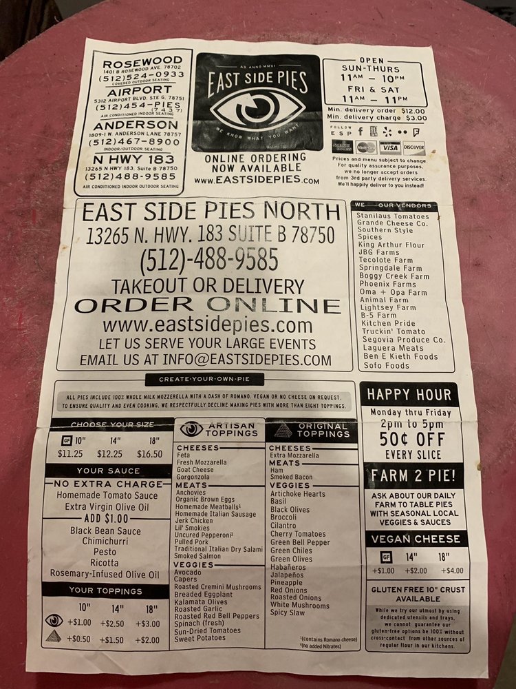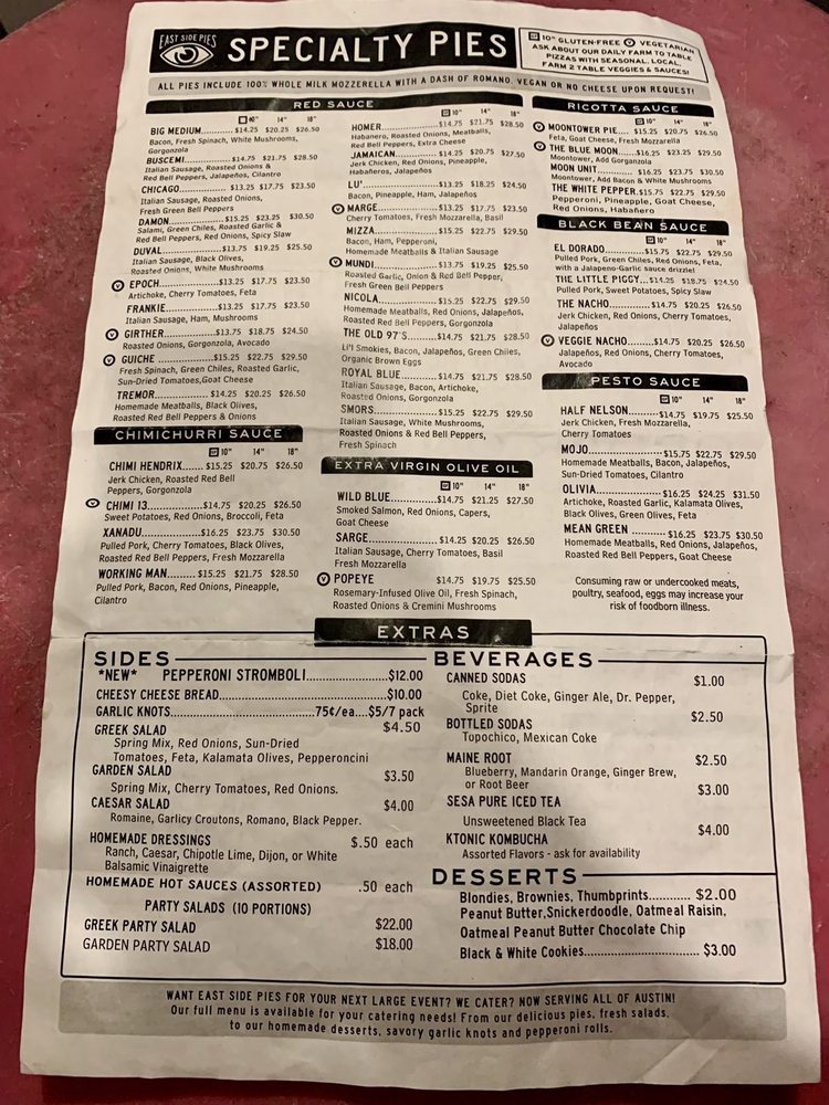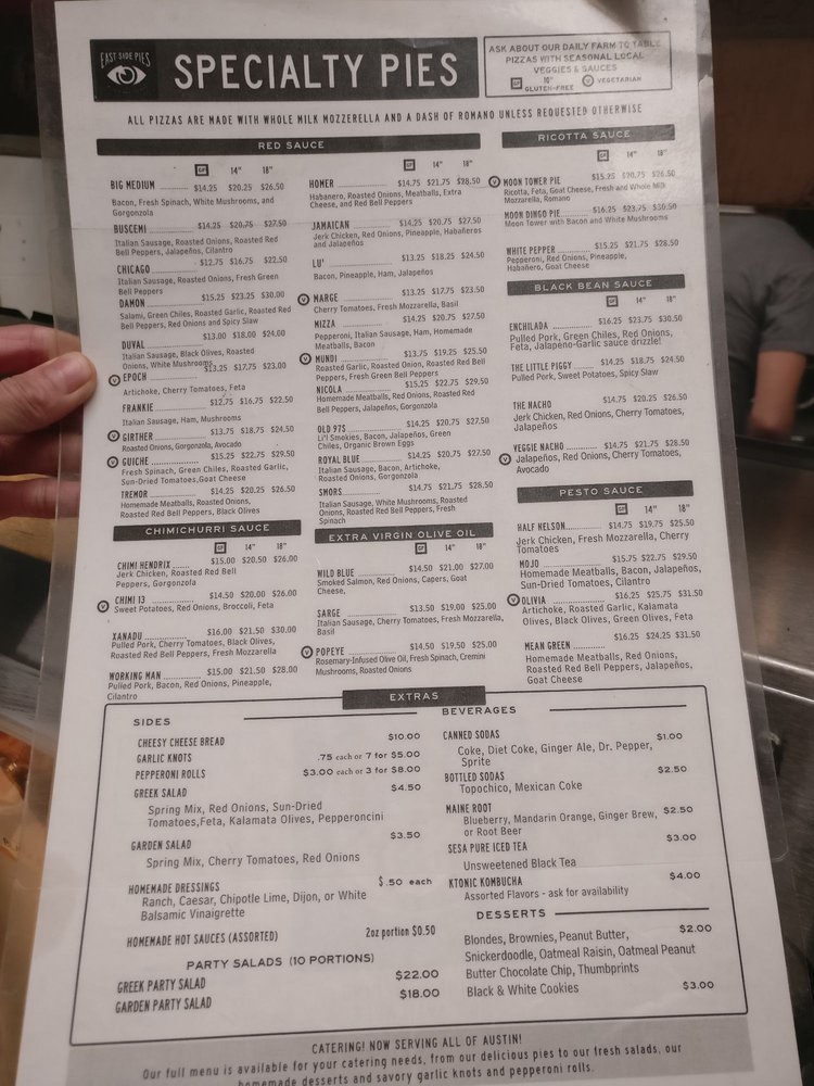 East Side Pies, located in Austin, Texas, offers a unique selection of thin-crust pizzas with a variety of toppings. Customers rave about the flavorful sauce and thin crust that holds up nicely. The menu includes options like the Marge, a classic margherita pizza, and the Lu', a delicious Hawaiian pizza with bacon, pineapple, ham, and jalapenos. Reviewers also praise the fast delivery service and the option to dine outside on the patio. While some mention the pizzas could use more sauce, overall, the food is described as delicious and the prices are reasonable. With options for vegans and vegetarians, East Side Pies is a great spot for lunch or dinner, offering a casual atmosphere for groups and families. Don't miss out on the opportunity to try their creative and tasty pizza combinations.